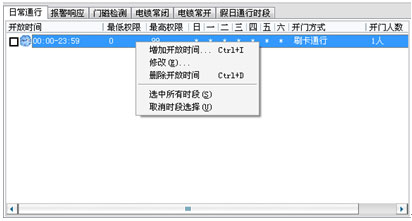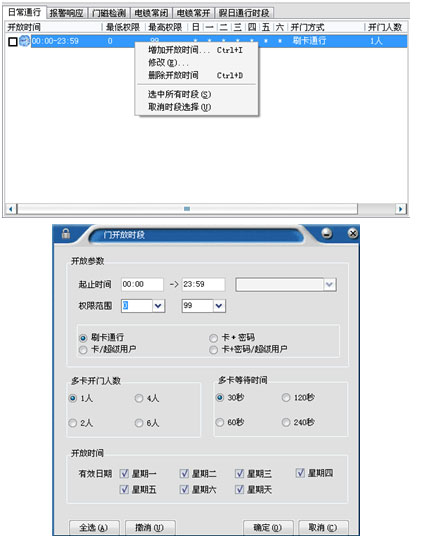 開放時(shí)段設(shè)置:系統(tǒng)對(duì)于每一個(gè)門,可以按照一周每一天設(shè)置開放時(shí)間段,每一個(gè)門最多一天可以設(shè)置30個(gè)開放時(shí)間段。節(jié)假日的時(shí)間段可以單獨(dú)設(shè)置。如下圖所示: