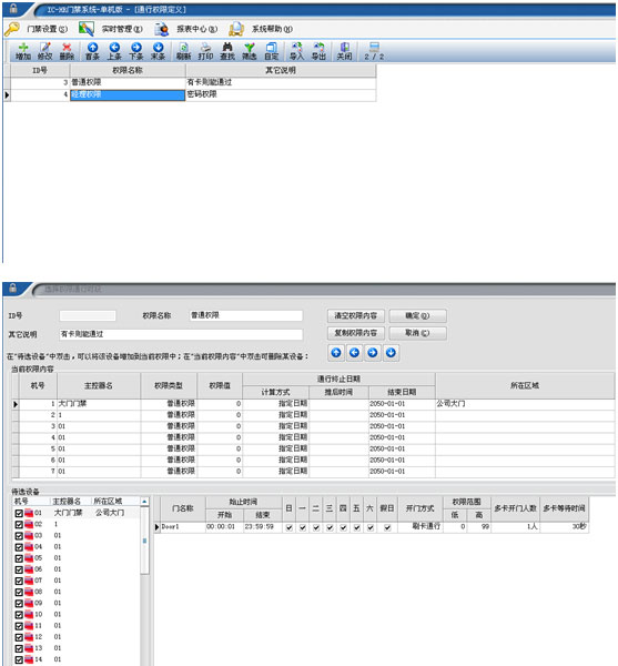 人員權(quán)限管理:門禁系統(tǒng)控制著多個(gè)門,每個(gè)都只允許有相應(yīng)權(quán)限的人出入,系統(tǒng)有三種權(quán)限控制方式,一是可以根據(jù)持卡人身份權(quán)限設(shè)定有效開門區(qū)域(控制器號(hào)碼及門號(hào)碼)。二是可對(duì)每個(gè)電子鑰匙設(shè)置不同的有效開放時(shí)段,且可以通過權(quán)限組定義組合出無(wú)數(shù)種權(quán)限類型,如企業(yè)普通職員只有在正常上班時(shí)間段才可有效開某些門,超出設(shè)定時(shí)段將禁止開門;三是系統(tǒng)可以設(shè)置每個(gè)時(shí)間段有不同的開門方式(單卡、雙卡、卡+密碼、密碼、常開通行等),分別對(duì)每張卡可以授權(quán)在不同時(shí)段使用不同的開門方式。