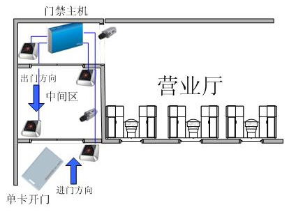 防尾隨功能就是指兩道門關(guān)聯(lián)在一起,進(jìn)入外面一道門前,先刷卡,認(rèn)證通過后門鎖開啟;進(jìn)入中間隔離區(qū)后必須關(guān)閉外面那道門,否則里面的門無(wú)法打開;關(guān)上外面的門之后再次刷卡,認(rèn)證通過后門鎖開啟。出門時(shí),操作跟進(jìn)門的時(shí)候類似,先開里面那道門,再開外面那道門。該功能可以有效防止有人跟隨進(jìn)入。主要用在金庫(kù)、營(yíng)業(yè)大廳進(jìn)入柜臺(tái)的通道,提高安全。